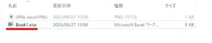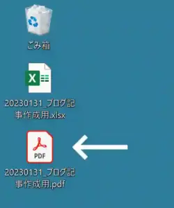 すると、Excelファイルを保存したときと同じフォルダ(Excelを保存したのがデスクトップならデスクトップ)に、PDFファイルが作成されます。赤い、PDFと書かれたマークが目印です。