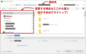 一番上の枠に、現在保存される予定のフォルダーが表示されています。変更する場合は、中段、左半分の大きい枠で保存したいフォルダ名をクリックします。こだわりがなければ「デスクトップ」を選んでおくと作ったファイルを見つけやすいです。