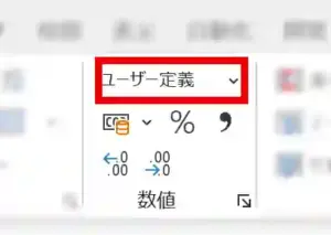 数値のところに四角い枠があって、おそらく「ユーザー定義」(または「標準」)と書かれていると思います。その枠の右端に「v」マークがあるのでクリックすると、標準の下にいろいろとメニューが広がって出てきます。