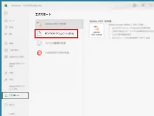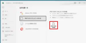 出てくるメニューの中から、「PDF/XPS ドキュメントの作成」が選ばれていることを確認します(選ばれていなかったら、クリックして選んでください)。