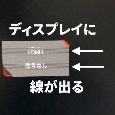 さらに、ケーブル接続なしでディスプレイ単体でも横線が入ることが確認できました(というか、初めからこれを確認していればケーブル買わなくて良かったのでは・・・)。