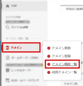 サイドメニューのドメインの中から、ドメイン機能一覧をクリックします。