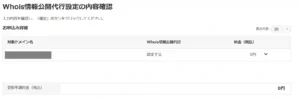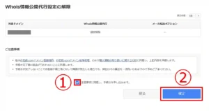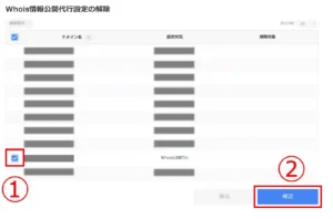 Whois情報公開代行設定を解除したいドメインのチェックボックスにチェックを付け、確認ボタンをクリックします。