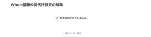ページ右下にある「Whois情報公開代行設定の解除は こちら」を探して、「こちら」をクリックします。
