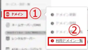 サイドメニューのドメインから、利用ドメイン一覧を開きます。