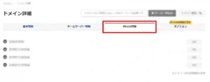 先ほどAuthCodeを確認したドメイン詳細画面(サイドメニューのドメイン > 利用ドメイン一覧 > ドメイン名をクリック)で、タブをWhois情報に切り替えます。