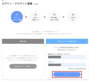 ログイン・アカウント登録の画面になります。私の場合はアカウントをすでに持っているのでログインしました。アカウントをお持ちでない場合、「XServerアカウントの登録へ」から登録を行ってください。