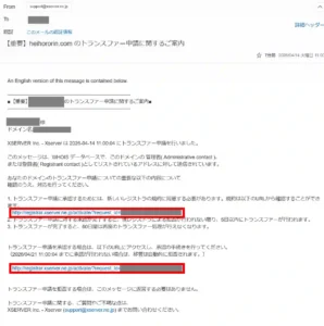 ドメイン移管の手続きで、確認メールのリンクから移管を承認するという作業があります。